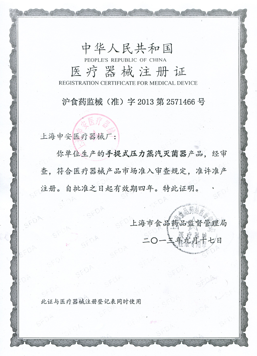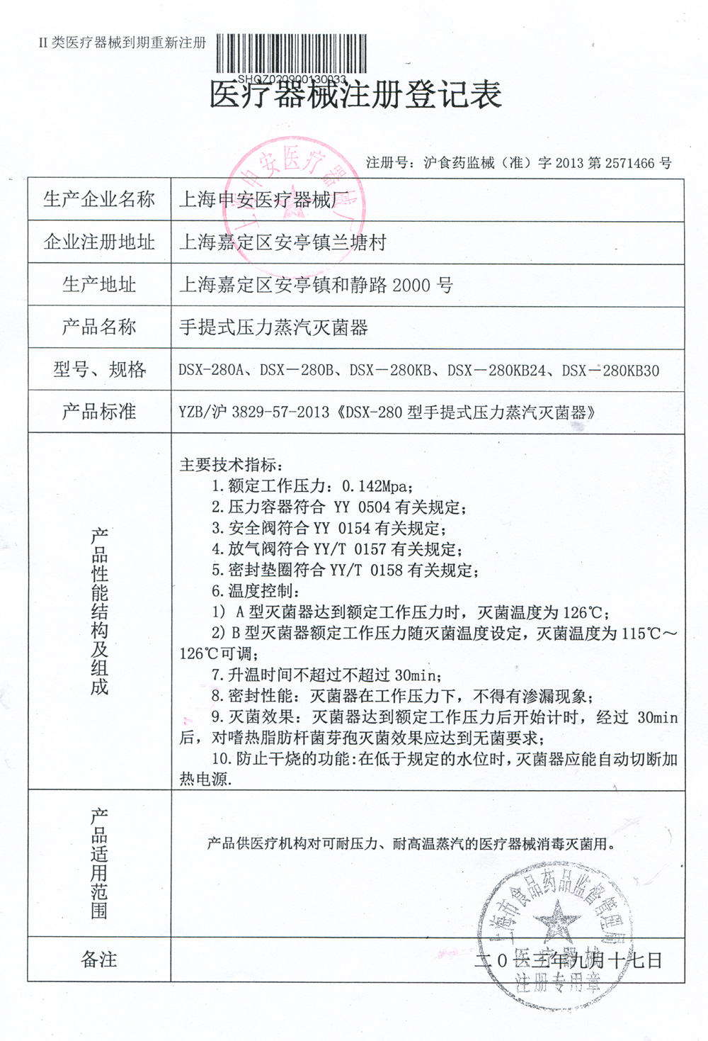 本品符合国家对压力容器设计与制作的相关规定,并取得了食药监产品注册证和消毒产品卫生许可证,是我厂研制开发的新一代手提式灭菌器,其结构先进可靠,具有快捷简便的操作方式和功能齐全的控制系统,在安全控制上;设置了锅内有压力自动锁盖及误操作合盖不升压的装置。本产品采用优质不锈钢材料精制而成,灭菌指标达到国家医用手术级标准,是各医疗卫生、大专院校、食品化工、生物科研等单位对器械、敷料、药液、食品器皿、培养基等物品进行消毒灭菌的理想产品。